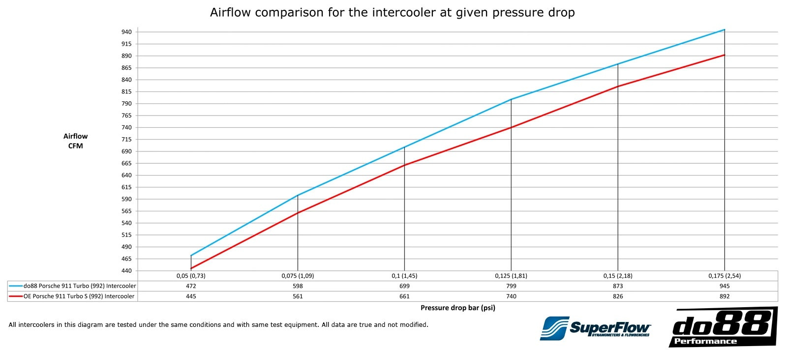 Cooling is important, and so is airflow. After many hours in the development, refining the end tanks and choosing a core to meet our demand, the result is an intercooler that is much more efficient in terms of heat transfer as well as airflow. Using our in-house flowbench, Superflow SF-1020 Probench, the airflow is verified for both the do88 intercoolers and the OE 992 units. What you see is what you get – true performance!