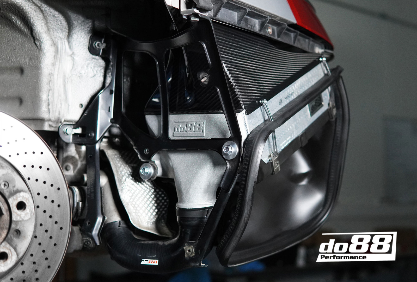 To optimally distribute the flow over the entire core, we use casting, flow-optimized tanks. A well designed tank is essential to maximize heat transfer properties and flow. Flow and cooling capacity directly depend on the dimensions of the core and to utilize as thick a core as possible, we have replaced the upper air guides with carbon fiber guides. These are designed by do88 with 3D scanning as a basis, which guarantees an excellent fit against both the car's bodywork and our large intercoolers.