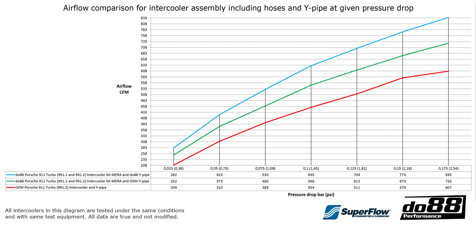 Cooling is important, and so is airflow. After many hours in the development, refining the end tanks and choosing a core to meet our demand, the result is an intercooler that is much more efficient in terms of heat transfer as well as airflow. Using our in-house Superflow SF-1020 Probench, the airflow is verified as a complete system with both intercoolers, hoses and y-pipe for both the do88 bigpack and the OEM 991 units. What you see is what you get – true performance!