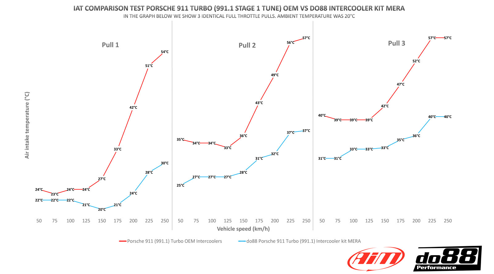 When it comes down to performance, the do88 bigpack significantly reduce the intake temperature! In the graph below the difference towards the OEM 991 units is presented. The data is collected with an AIM race logger under 5 consecutive runs in an immediate sequence. Full throttle accelerations between 50-250 km/h (30-155 mph) in a Stage 1 tuned Porsche 991. No cooldown in between, just full pull. During every test, the car was driven in Sport Plus, AC off.