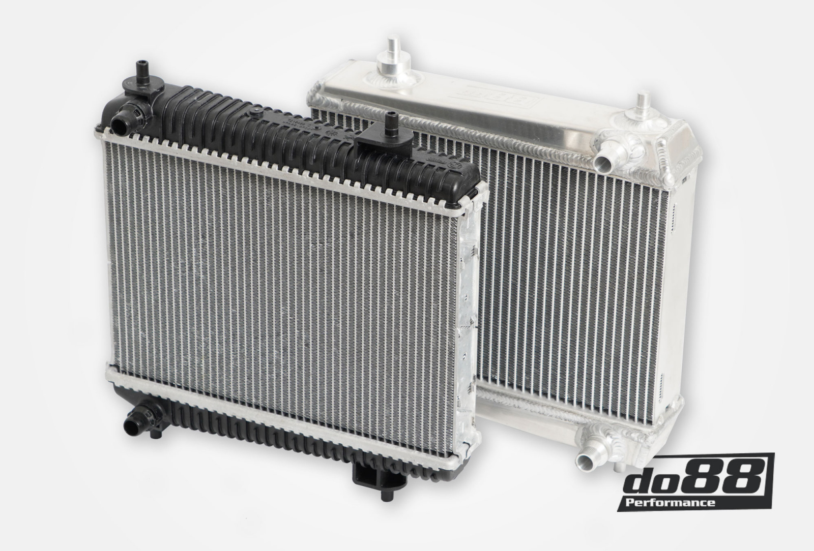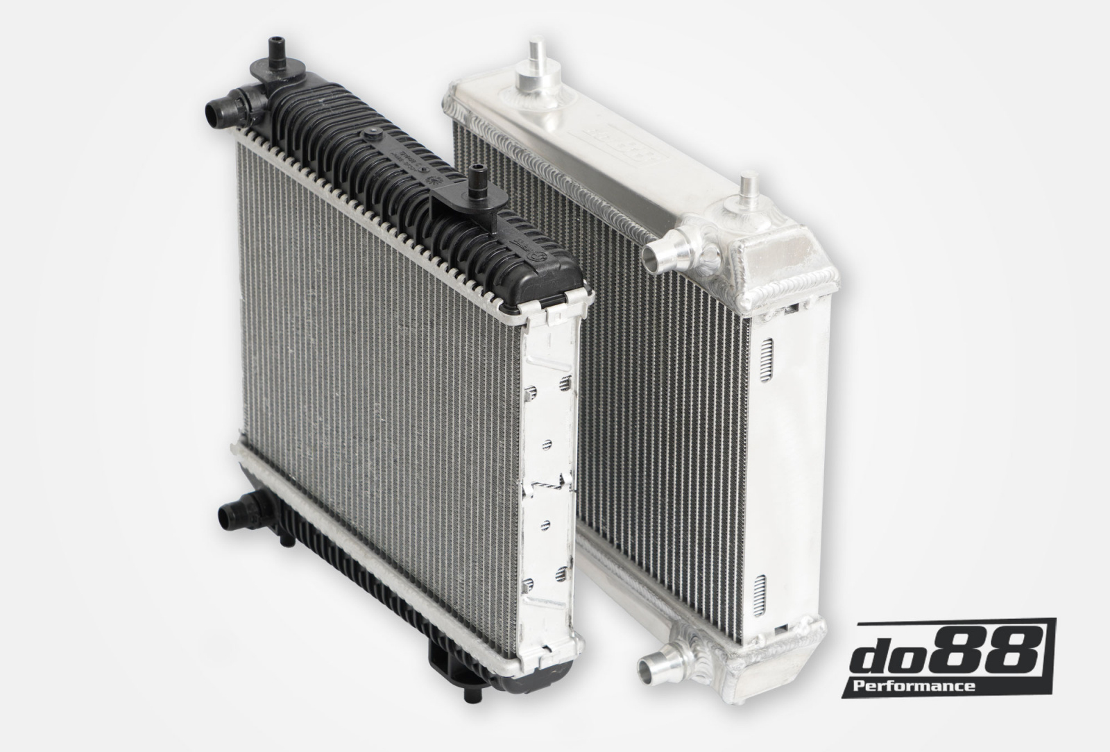 Fortunately, the design space available for the auxiliary radiators allows for both increased frontal surface area and core thickness on both sides of the car. The OE radiator is identical for both sides, and our do88 Performance Radiators are designed to be drop-in replacements for both left and right sides. We offer them as a pair because upgrading just one radiator isn't as effective as upgrading both simultaneously. Our Performance Auxiliary Radiators provide enhanced cooling capacity to prevent heat soaking.