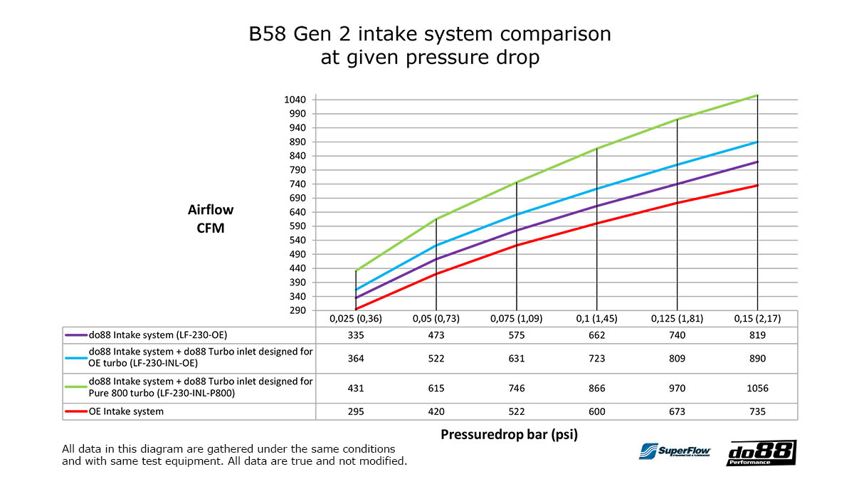 Tests conducted in our SuperFlow SF1020 flow bench, clearly demonstrates the importance of this optional Turbo inlet. The intake system alone offers a substantial 15 % airflow increase. Combined with the do88 Turbo inlet (for OE Turbo), the overall airflow increase is a whopping 23 %! We strongly recommend this combination.