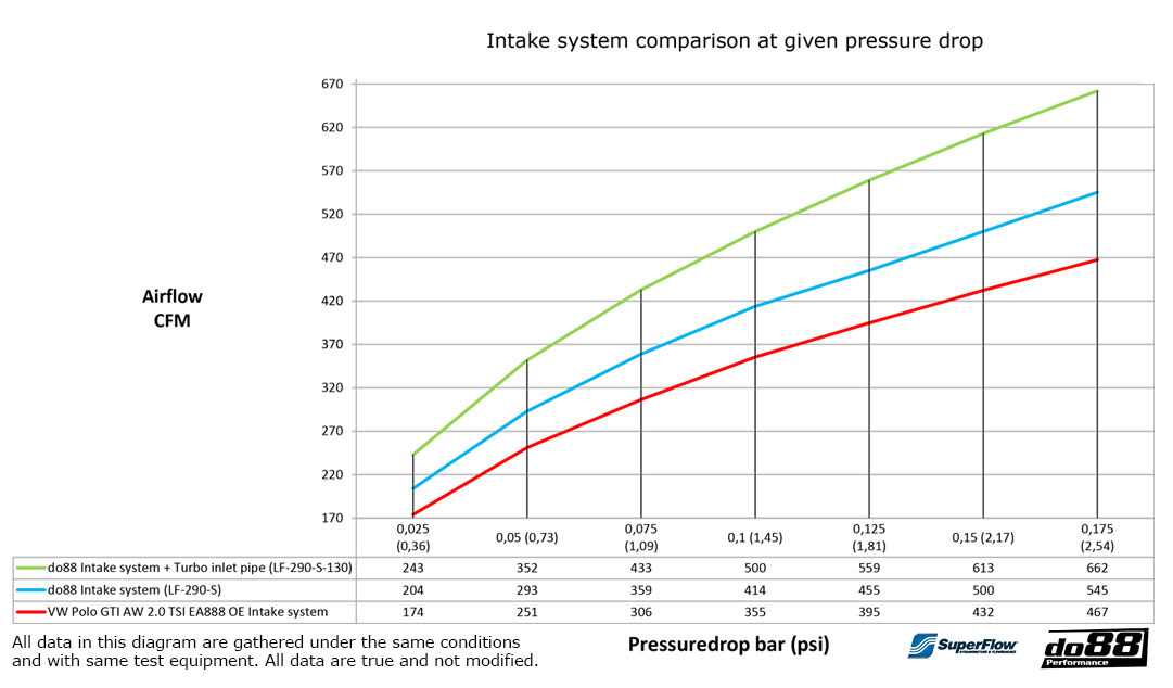 Tests conducted in our SuperFlow SF1020 flow bench, clearly demonstrates the importance of this optional Turbo inlet hose and pipe. The intake system alone offers a substantial 17 % airflow increase. Combined with the do88 Turbo inlet hose and 3” inlet pipe, the overall airflow increase is a whopping 42%! We strongly recommend this combination.