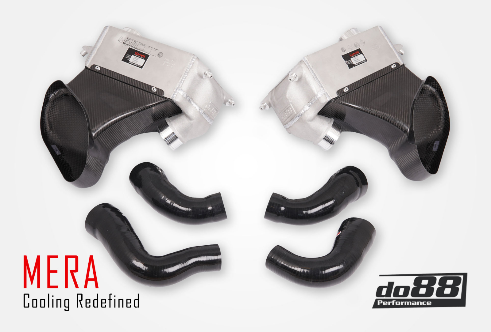 The intercoolers feature cast end tanks that distribute the airflow over the full core in a very precise way. This is very important as a good tank design will be beneficial for both pressure drop and cooling efficiency. To be able to fit an intercooler with appropriate thickness for the job, it was also necessary to design a new upper ambient air guide. This was designed in our 3D-scanned environment to ensure perfect fitment to the vehicle-integrated air guides, as well as the intercooler. To further remove bottlenecks, the intercooler kit MERA has intercooler connections that are 70 mm (2 3/4 inch) to really allow for the air to pass without restriction. This also means that there are new hoses included for each position, of which all are 3D-designed with maximum airflow in mind. All hoses are CFD-tested to ensure this. The hoses on the turbo outlet are made from a high-temp spec. material, rated to 240°C (464°F) continuous temperature. In order to really take advantage of all the heat-transferring ambient air, the carbon ducts come with proper seals towards the body, forcing all of the air to pass through the core, and not escape around it.