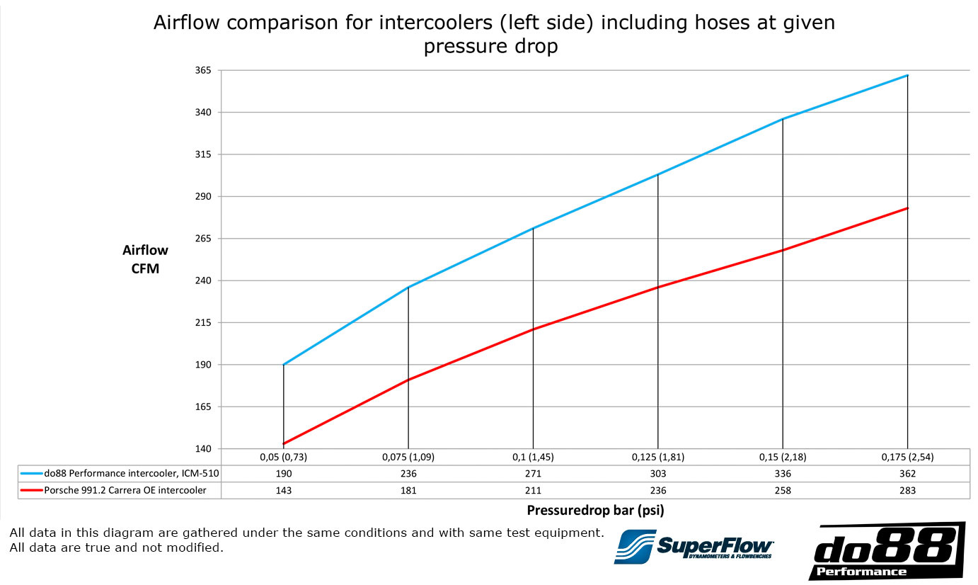 Cooling is important, and so is airflow. After many hours of development, refining the end tanks and choosing a core to meet our demand, the result is an intercooler that is much more efficient in terms of heat transfer as well as airflow. Using our in-house Superflow SF-1020 Probench, the airflow is verified as a complete system, with hoses on both inlet and outlet, for both the OEM 991 intercoolers, and the do88 performance intercoolers.