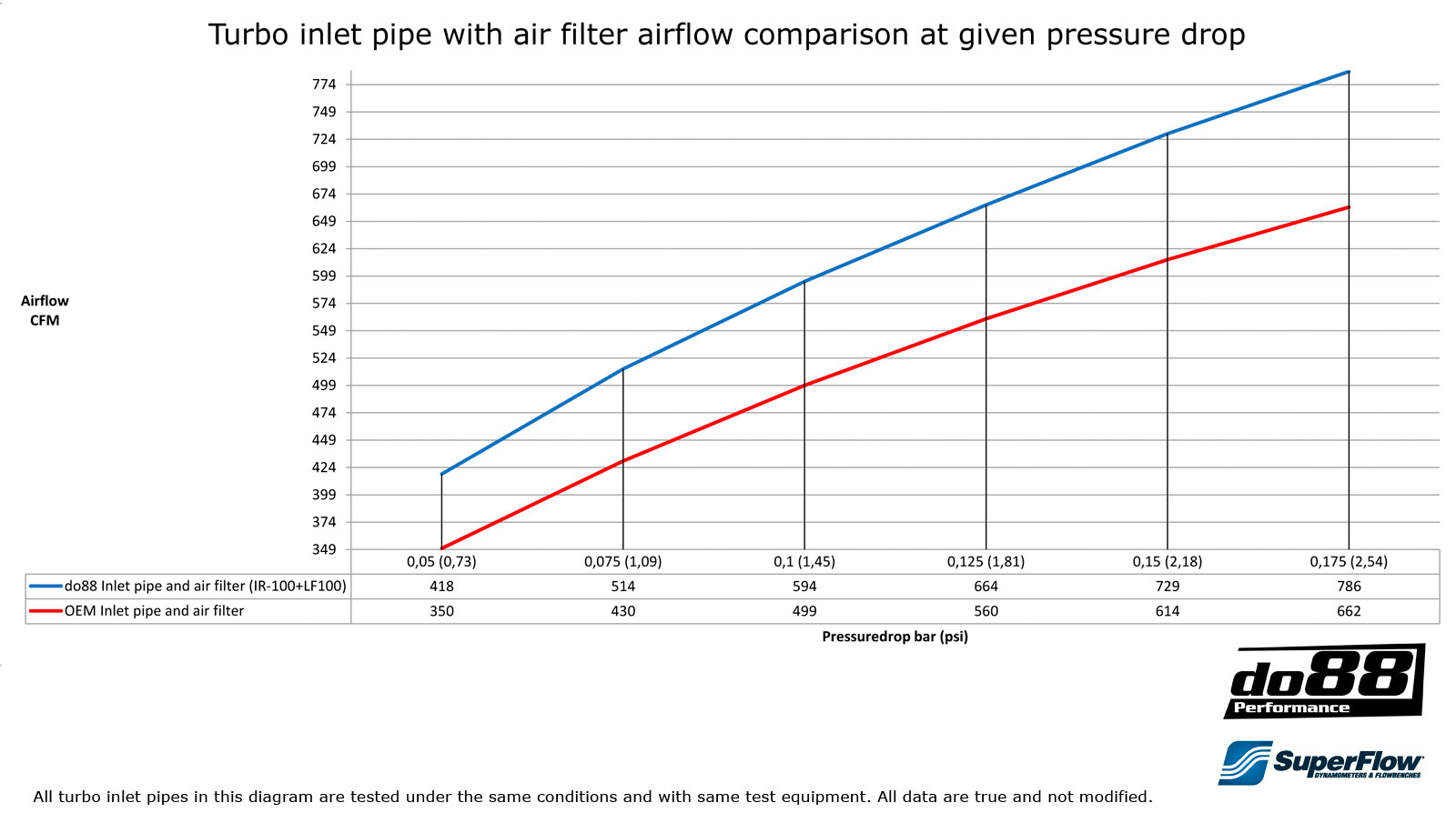 do88 turbo inlet pipe has an air flow at 0,125bar/1,81psi pressure drop of 664CFM*, compared to the OEM pipe and air box that has 560CFM!