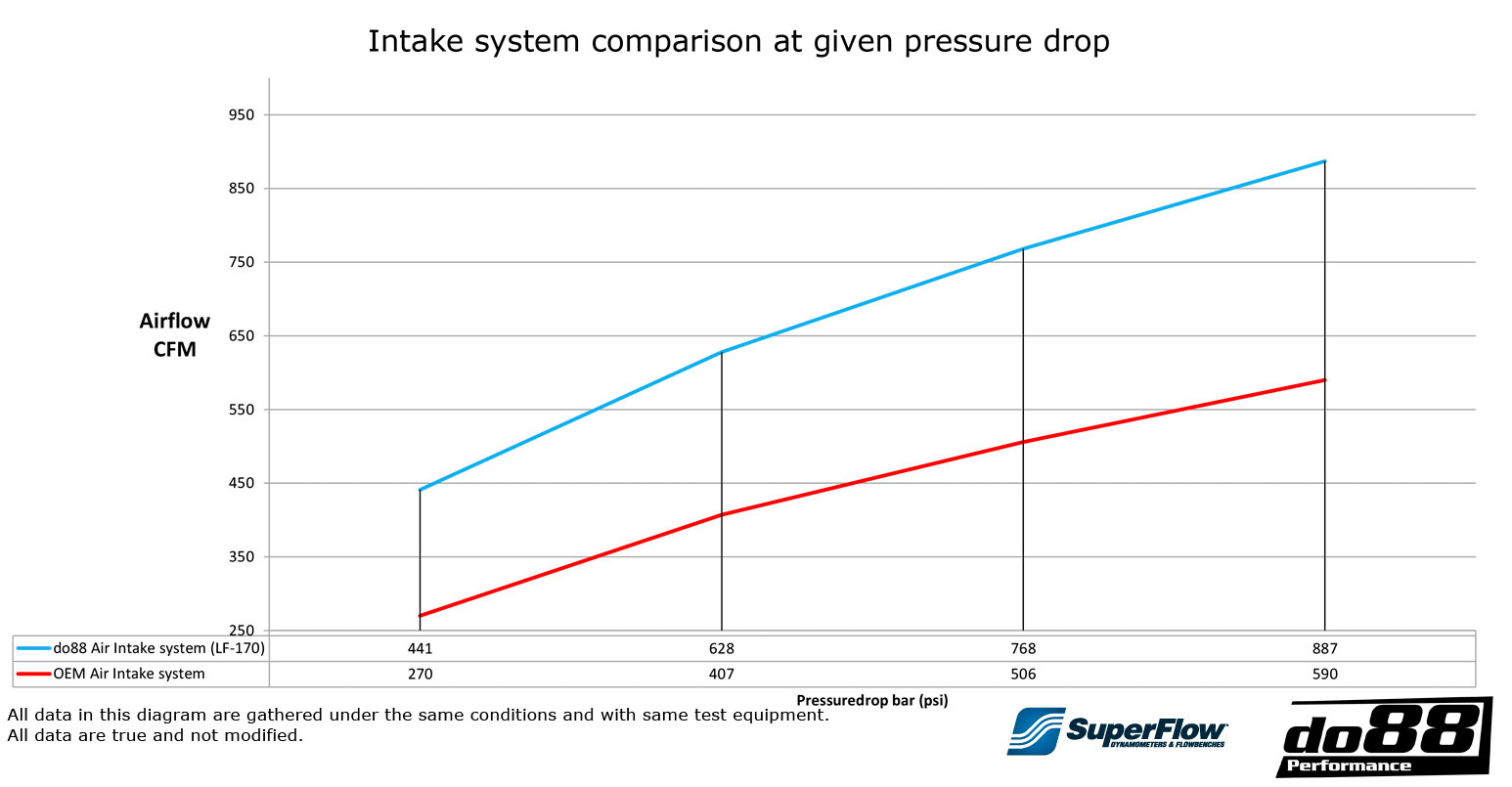 do88 turbo inlet pipe has an air flow at 0,125bar/1,81psi pressure drop of 991 CFM, compared to the OEM pipe and air box that has 657 CFM!