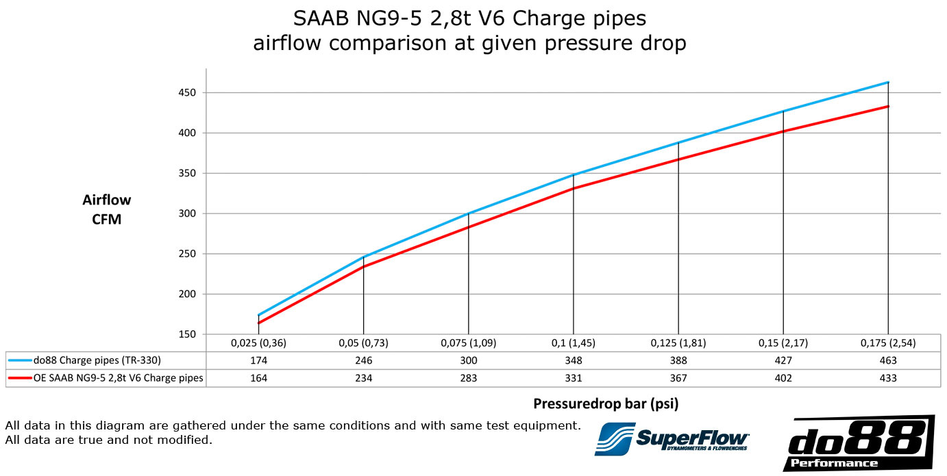Our charge pipe has considerably better airflow than stock. This is verified by several tests, both in car and in our own SuperFlow SF-1020 flow bench.