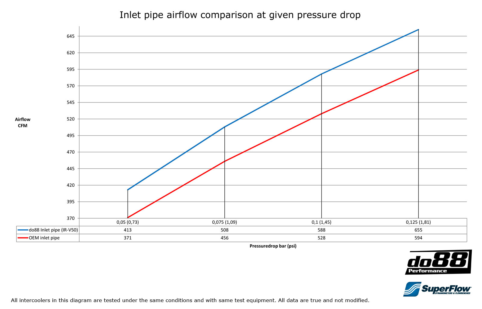 do88 turbo inlet pipe has an air flow at 0,15bar/2,18psi pressure drop 655CFM, compared to the OEM pipe that has 594CFM. The turbo inlet pipe is manufactured in 3” mandrel bent seamless aluminium pipe. Custom made high quality silicone hoses with 4 layers of polyester reinforcement and steel wire. These hoses can handle very high temperature and vacuum!