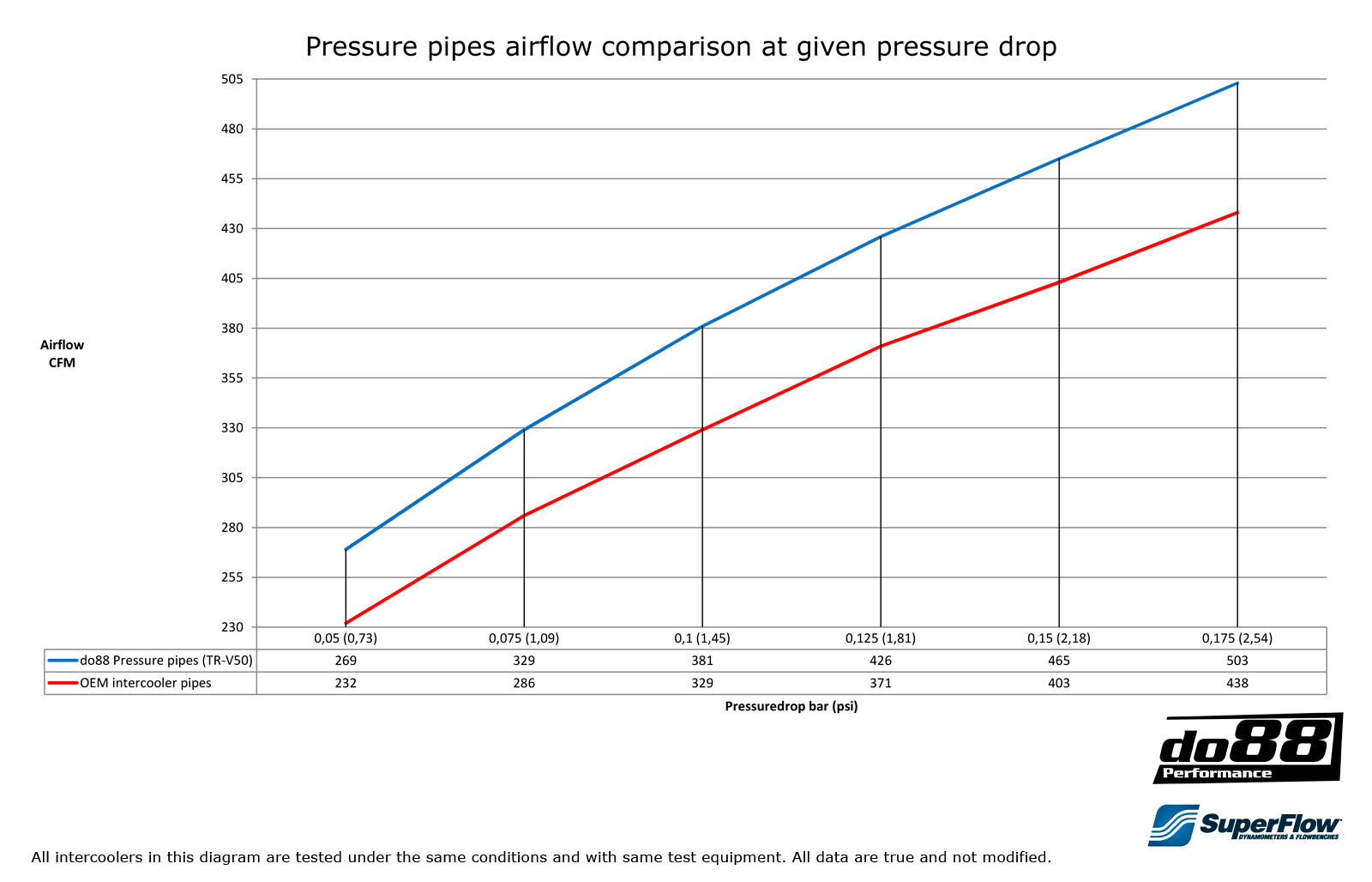 This kit is for you with high horsepower goal and wants to upgrade to the absolute best! Our pressure pipe has considerably better airflow than the stock pipe, this we have verified in several tests both in car and in our own SuperFlow SF-1020 flow bench.